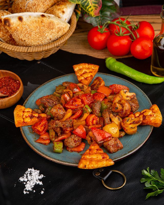 Мякоть ягненка, специальный маринад, перец болгарский, турецкая лепешка, грибы шампиньоны, томаты, масло сливочное