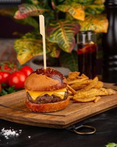 Мраморная говяжья котлета, карамелизированный лук, сыр чеддер, картофель пай, соус из красной капусты, булочка, картофель фри