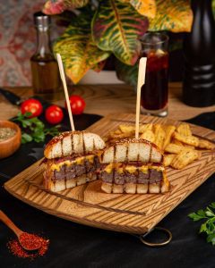 Мраморная говяжья котлета, бастурма, карамелизированный лук, сыр чеддер, булочка, картофель фри
