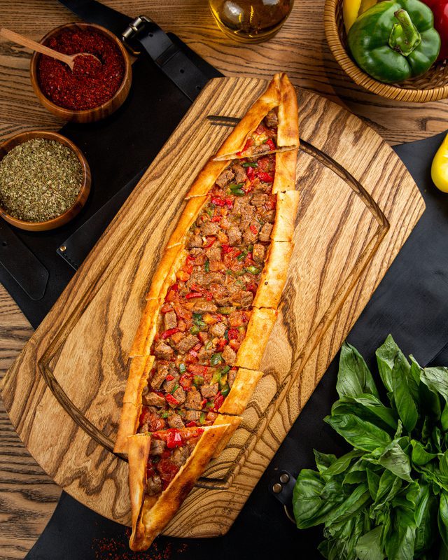 Лепешка с мелко нарезанным мясом ягненка, свежими овощами, испеченная в печи