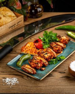 Рубленое филе бедра курицы, маринованное в специальном соусе, томаты на гриле, зеленый острый перец, турецкая лепешка