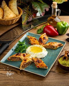 Кебаб из ягненка с овощами и бастурмой в тонком тесте с кунжутом, подаётся с сюзме и медом, посыпается фисташкой