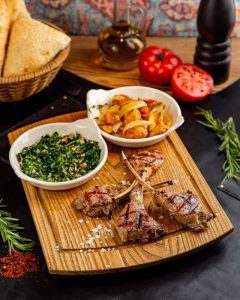 Спинка ягненка на гриле, подается с овощами, турецкой лепешкой и соусом алиназик