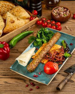Рубленное мясо ягненка, болгарский перец, чеснок, лаваш турецкий, подается с сюзме и томатным соусом