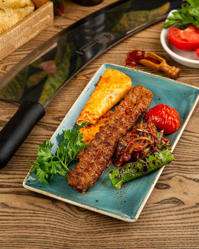 Рубленое мясо ягненка, болгарский перец, жареные томаты, зеленый острый перец, лук красный, зелень, турецкий лаваш