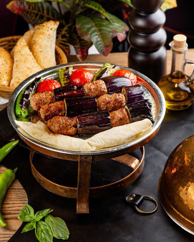 Рубленое мясо ягненка, баклажан, томаты, перец зеленый острый и турецкий лаваш