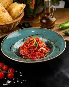 Томат, лук красный, грецкий орех, острый перец, гранатовый соус, гранат оливковое масло, зерна граната, зелень