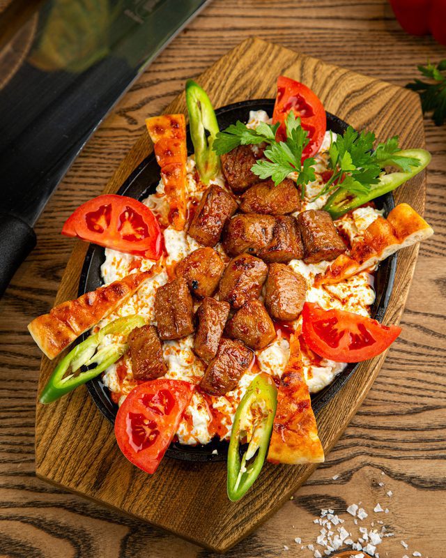 Мякоть ягненка, баклажан, сюзме, чеснок, специальный соус, томаты, острый зеленый перец, лепешка турецкая