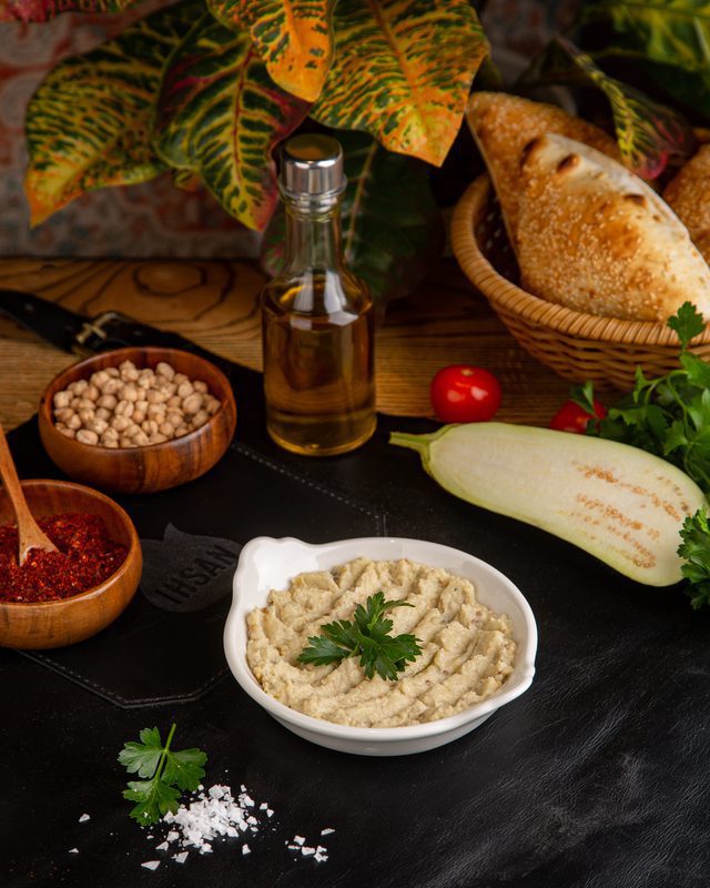 Баклажан, запеченный на углях, оливковое масло, молоко, яйцо, лимон