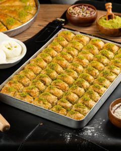 Турецкая баклава из тонкого теста с фисташками, форма грецкого ореха
