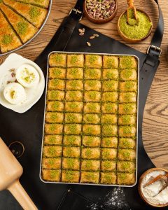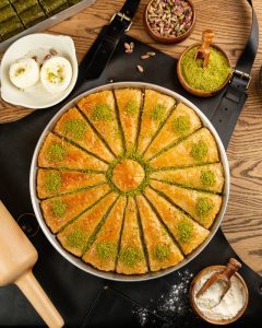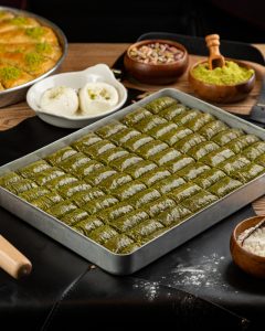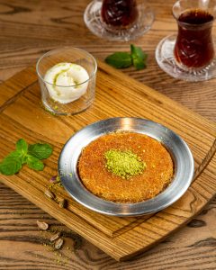 Хрустящее тесто кадаиф, пропитанное сиропом, с начинкой из турецкого сыра, фисташковой крошки, подается с турецким мороженым